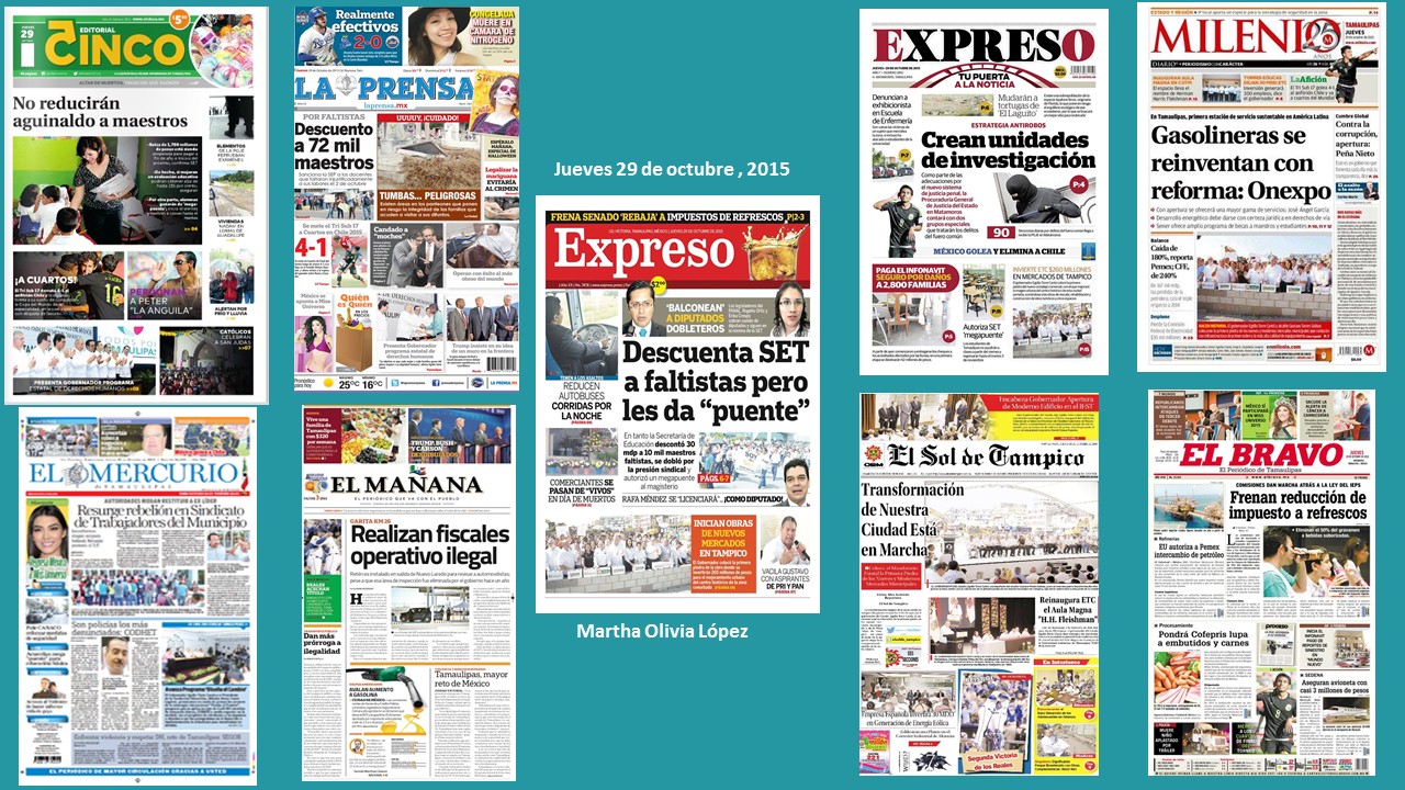 En 3 de los nueve portadas de medios impresos que les presentamos hoy, el tema recurrente es el de los trabajadores de la educación, tanto a nivel nacional donde a unos 72 mil se les descontó el día 2 de octubre por haberse ausentado de clases en Michoacán, Oaxaca, Colima, Tabasco y Zacatecas, mientras que en el estado se habla de que a cambio se les dará un mega puente que comienza mañana viernes.