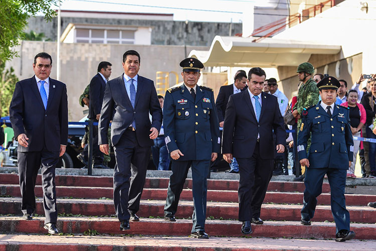 La ceremonia cívica-militar la encabezó el Gobernador de Tamaulipas, Francisco García Cabeza de Vaca acompañado del general Luis Crescencio Sandoval y del alcalde Enrique Rivas