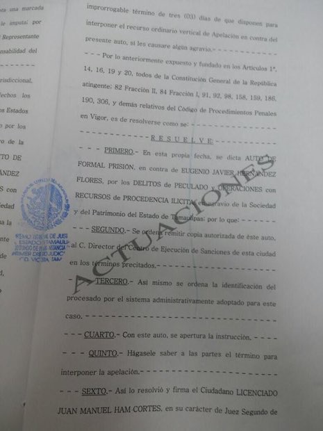 “Se dicta Auto de Formal Prisión, en contra de Eugenio Javier Hernández Flores por los delitos de peculado y operaciones con recursos de procedencia ilícita en agravio de la Sociedad y del Patrimonio del Estado de Tamaulipas.