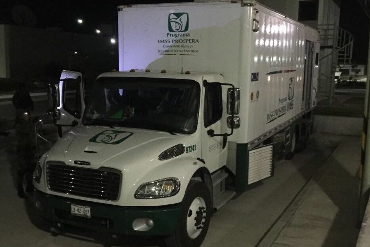 Los paquetes “estaban ocultos en un equipo médico (tomógrafo) el cual estaba instalado en un camión color blanco con logotipos del I.M.S.S idéntica a una unidad médica móvil”, señala el comunicado.