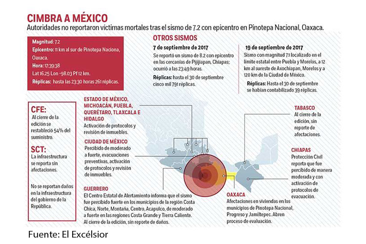 Ciudad de México.- Un sismo de magnitud 7.2 se sintió aproximadamente a las 17:30 horas de ayer en al menos ocho estados del centro y sur del país. Los mayores daños se reportaron en los municipios de Jamiltepec y Pinotepa Nacional, Oaxaca, donde tuvo lugar el epicentro, mientras en las demás entidades sólo hubo afectaciones leves. En algunas entidades se cayó por minutos el servicio telefónico. La Comisión Federal de Electricidad (CFE) reportó que 998 mil hogares y comercios se quedaron sin energía eléctrica durante varias horas.