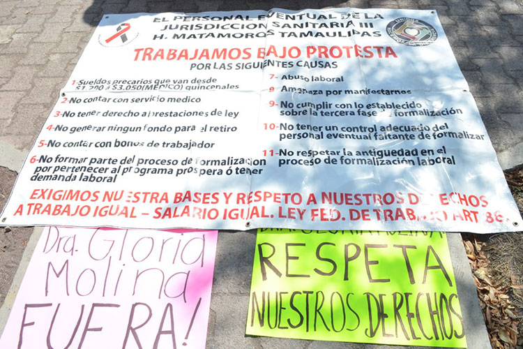 La manifestación incluyó la exigencia de la renuncia de la Secretaria de Salud Gloria Molina Gamboa quien, ordenó la presencia de elementos de la Policía Estatal para que detuvieran a los trabajadores, quienes lograron que una comisión llegará hasta las oficinas del titular de Recursos Humanos de apellido Garza.