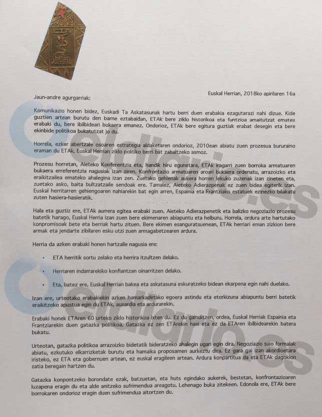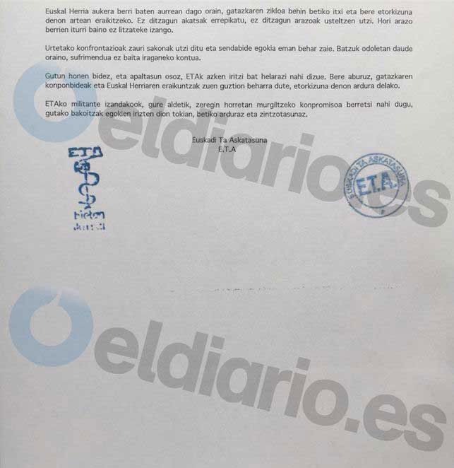En la carta publicada por eldiario.es en su portal, ETA reconoce su responsabilidad al no resolver el “conflicto político” vasco.