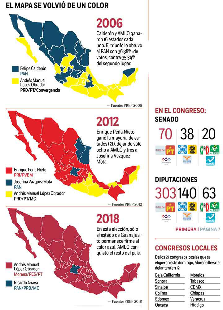 Ciudad de México.- El país se pintó con los colores de Morena, el partido que llevó a Andrés Manuel López Obrador a la Presidencia.