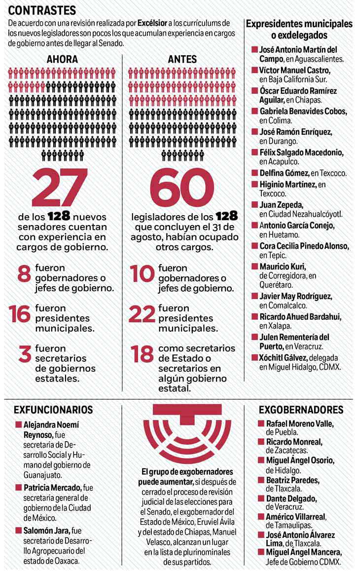 El perfil de experiencia de gobierno de los nuevos senadores contrasta con los senadores que concluyen su mandato el 31 de agosto, ya que durante la LXII y LXIII Legislatura, 60 de los 128 legisladores federales tienen antecedentes en puestos de gobierno; de ellos, 10 como gobernadores o Jefe de Gobierno; 22 como presidentes municipales y 18 como secretarios de Estado o secretarios en algún gobierno estatal.