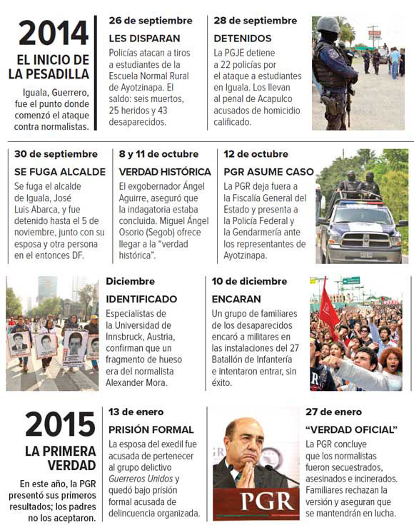 Las acciones en las que desaparecieron ocurrieron en nueve escenarios distintos en un perímetro de 180 kilómetros, entre las 9:30 de la noche del 26 de septiembre de 2014 y las 2 de la madrugada del día siguiente. Y de esas acciones, distintas autoridades tuvieron conocimiento y no hicieron nada. Hubo fotografías y videos que no se hicieron públicos porque supuestamente fueron destruidos.