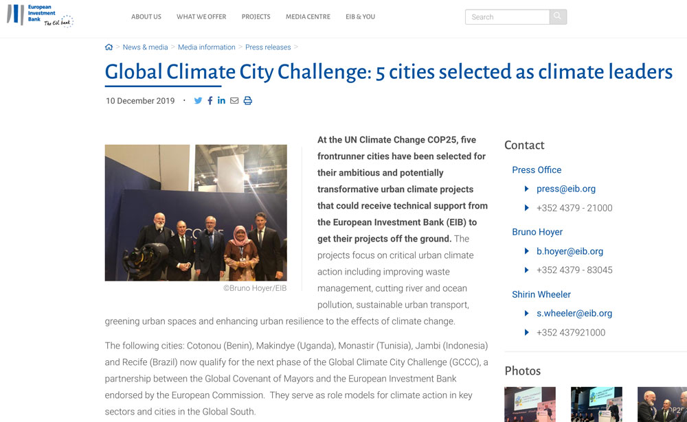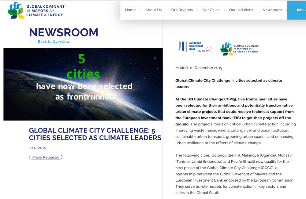 Las ciudades seleccionadas son: Cotonou (Benin), Makindye (Uganda), Monastir (Túnez), Jambi (Indonesia) y Recife (Brasil) ahora califican para la próxima fase del Global Climate City Challenge (GCCC), una asociación entre el Pacto Mundial de Alcaldes y del Banco Europeo de Inversiones avalado por la Comisión Europea. Sirven como modelos a seguir para la acción climática en sectores y ciudades clave en el Sur Global.