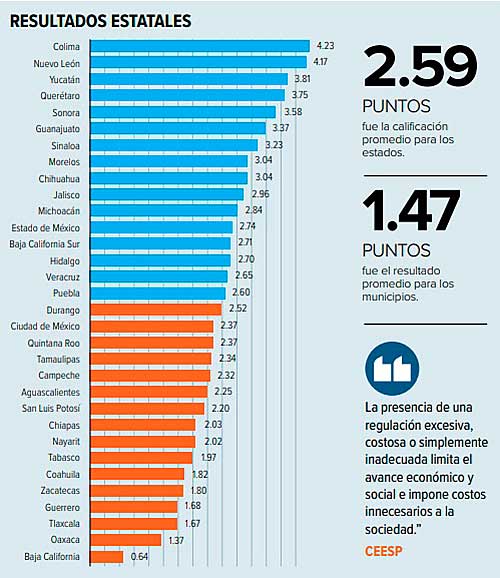 El organismo empresarial, que dirige Carlos Hurtados López, presentó los resultados del Indicador Subnacional de Mejora Regulatoria (ISMR), en el cual el promedio de calificación para los estados fue de 2.59 puntos, de una escala de 0 a 5, donde cinco es la mayor puntuación. Para los municipios la calificación promedio fue de 1.47 puntos.