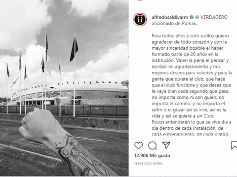 “Mis mejores deseos para ustedes y para la gente que quiere al club, que hace que el club funcione y que desea que le vaya bien cada segundo que pasa, no importa cómo, ni con quien, no importa el camino y no importa el sufrir o el gozar, así se vive, así es la vida y así se quiere a un club. Hoy termina mi ciclo en la institución y no puedo dejar de agradecer a cada persona que durante estos 20 años convivimos y nos vimos pasar y saludar. A cada persona honesta que forma y formó parte del club, gracias. Lo mejor para ti Pumas”, Fue parte de lo que escribió el apodado “Pollo”.