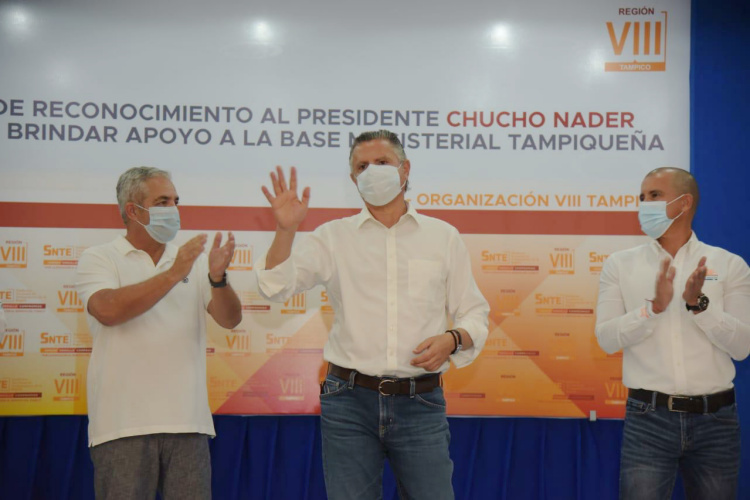 Tampico, Tamaulipas.- El Presidente municipal Chucho Nader recibió la tarde de este jueves, un reconocimiento por parte de la coordinación de Secretarios Generales del SNTE por el apoyo que la autoridad municipal ha destinado a la base magisterial de Tampico durante su administración.