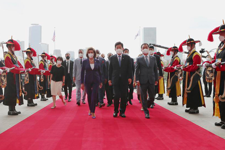El jueves se reunió con el presidente de la Asamblea Nacional de Corea del Sur, Kim Jin Pyo, y otros miembros importantes del Parlamento. Después de esa reunión de una hora, Pelosi habló sobre la alianza bilateral, forjada con sangre durante la Guerra de Corea de 1950-53, y los esfuerzos legislativos para impulsar los lazos, pero no mencionó directamente su visita a Taiwán ni las protestas chinas.
