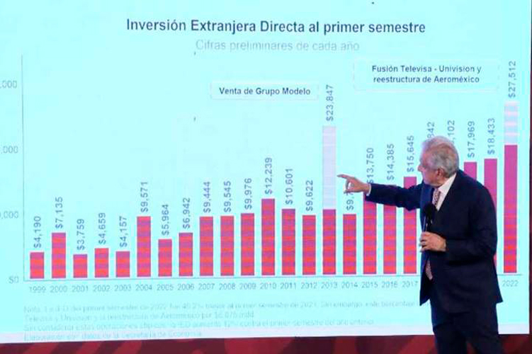 Ciudad de México.- El presidente Andrés Manuel López Obrador celebró el nivel histórico que alcanzó la inversión extranjera directa en México durante el primer semestre, la cual ascendió a los 27 mil 512 millones de dólares.