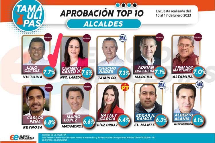El Presidente Municipal de Victoria aparece ligeramente por arriba de la Presidenta Municipal de Nuevo Laredo Carmen Lilia Canturosas y el Alcalde de Tampico Jesús Nader, al ser de los mejores evaluados en Tamaulipas.
