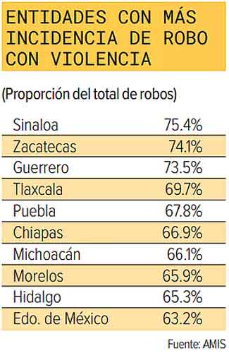 La directora de la AMIS mencionó que el 55.11% del robo de vehículos fue con uso de violencia, una baja con respecto a otros años. “Pasó del 60 por ciento al 55 por ciento; sin embargo, hay entidades que rebasaron este porcentaje.