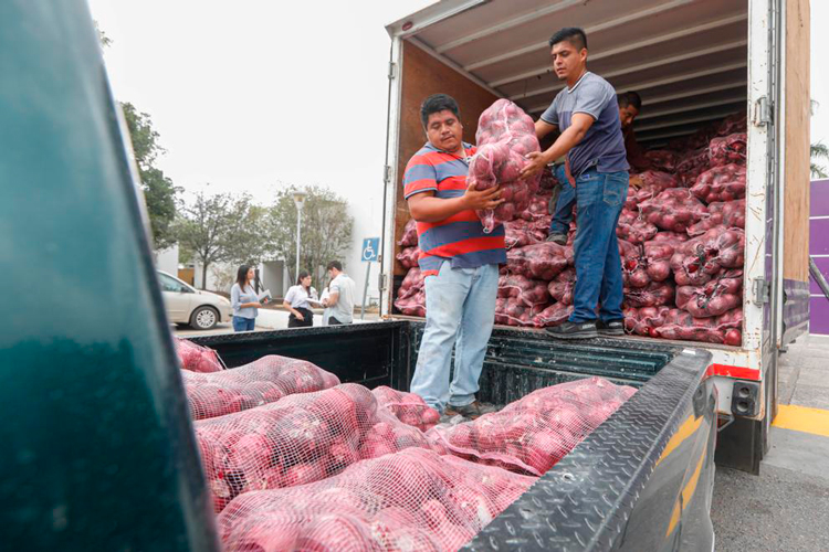 Fueron 19 toneladas de cebolla morada, las que los propios agricultores llevaron hasta el estacionamiento de la institución, lugar en el que de inmediato se inició con la distribución.