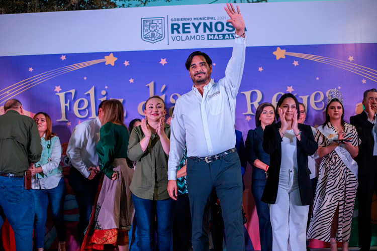 Reynosa, Tamaulipas.- En una multitudinaria celebración de Día de Reyes, más de 3,000 reynosenses eligieron acompañar al Alcalde Carlos Peña Ortiz en la plaza principal Miguel Hidalgo, donde disfrutaron de presentaciones artísticas, rifa de regalos, el corte de la tradicional Gran Rosca de Reyes y el apagado del Monumental Pino de Navidad.
