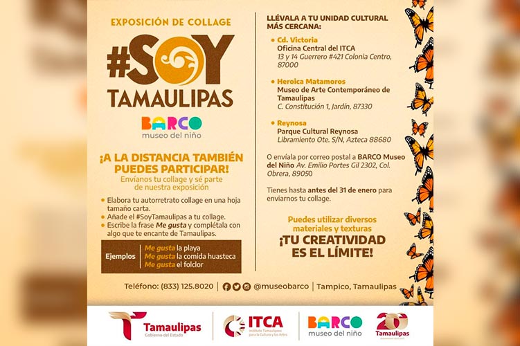 Ciudad Victoria, Tamaulipas. – El Instituto Tamaulipeco para la Cultura y las Artes (ITCA), en colaboración con el Barco Museo del Niño, invita a la comunidad a participar en la Exposición de Collage #SoyTamaulipas, una iniciativa que fusiona la creatividad con el amor por nuestra hermosa tierra.