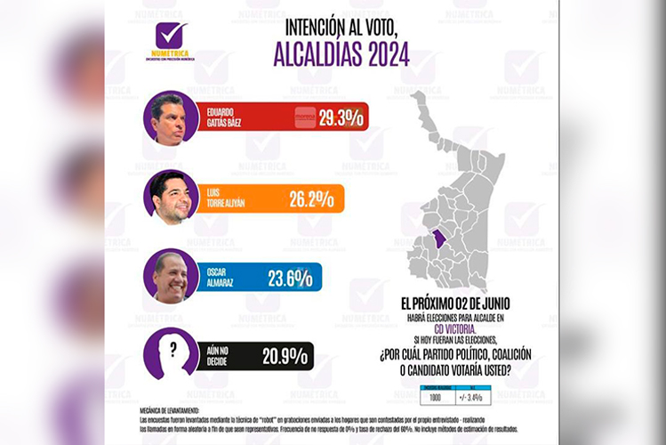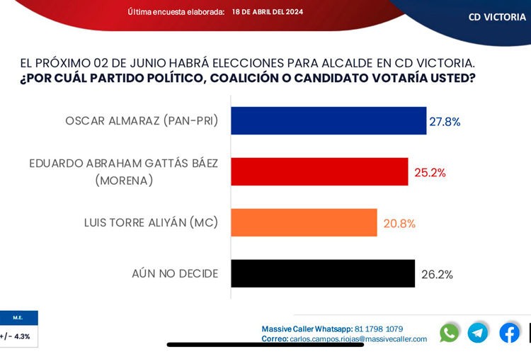 Por otro lado, Massive Caller también ha realizado su análisis situando a Torre Aliyán por encima del 20% de la intención del voto. Es importante destacar que ambas encuestadoras coinciden en un aspecto crucial y es que el próximo presidente municipal de Victoria será aquel capaz de persuadir al poco más del 20% del electorado indeciso.