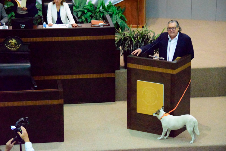 Ciudad Victoria, Tamaulipas.- El diputado de Movimiento Ciudadano Gustavo Cárdenas, llegó al pleno del Congreso del Estado con una perrita llamada “Perrucha”, para presentar una iniciativa que proteja a los animales que actualmente están en custodia’ del Poder Legislativo.