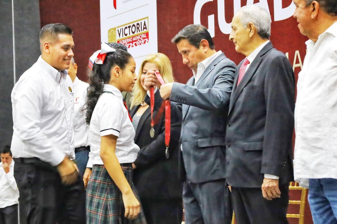 Ciudad Victoria, Tamaulipas.- Con la imposición de la medalla “Guadalupe Victoria”, el Gobierno Municipal que preside el alcalde Eduardo Gattás Báez reconoció a alumnos y maestros destacados en el ámbito educativo y académico de nivel primaria.