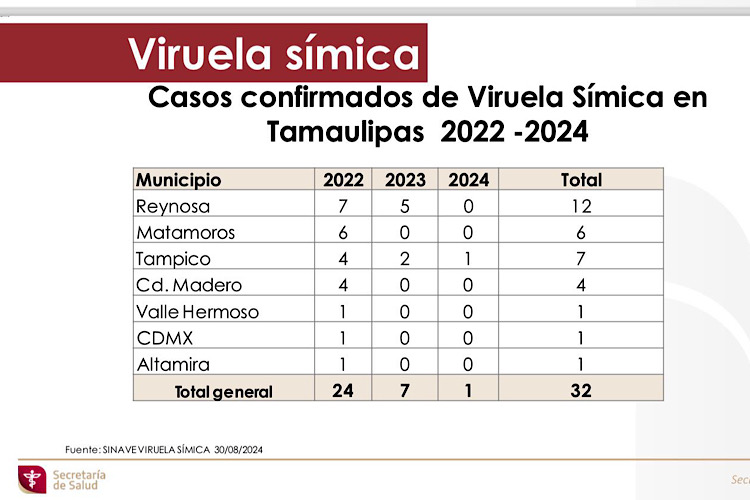 Expuso que al día de hoy, Tamaulipas registran, desde el 2022, 32 casos confirmados de viruela símica, de los cuales, siete se reportaron en 2023 y uno fue detectado en abril del presente año en Tampico.