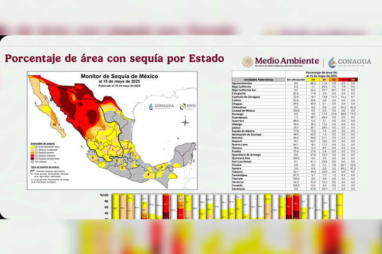 Ciudad Victoria, Tamaulipas. – En Tamaulipas, el 87.3 por ciento de la superficie del estado no presenta afectaciones por sequía, y solo el municipio de Nuevo Laredo ha alcanzado el nivel de sequía extrema, según el informe más reciente del Monitor de Sequía en México, fechado al 15 de mayo.
