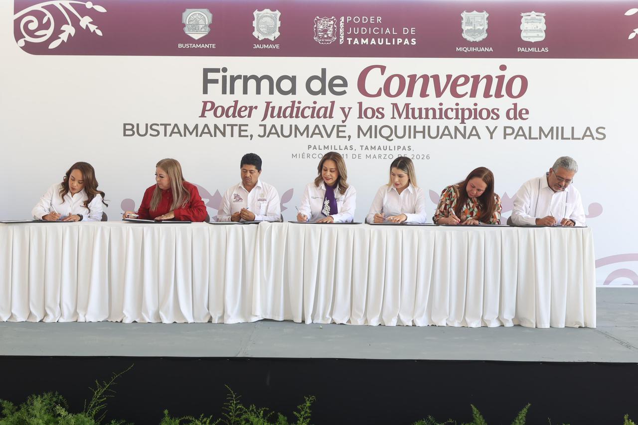 El convenio fue firmado por la magistrada presidenta del Poder Judicial, Tania Contreras López, junto a los alcaldes Manuel Báez Martínez de Jaumave, Maricela Rodríguez González de Bustamante, Gladis Magalis Vargas Rangel de Miquihuana y Sindy Paoleth Monita Ramírez de Palmillas.