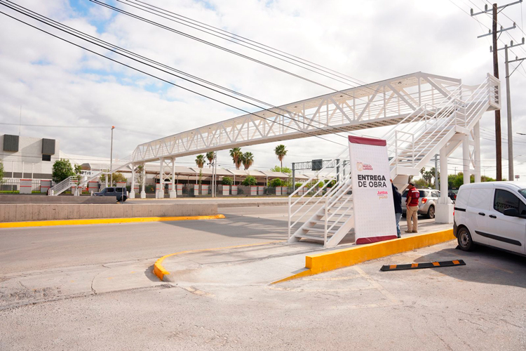 Nuevo Laredo, Tamaulipas.- Atendiendo una demanda prioritaria de seguridad para peatones en una de las vialidades con mayor flujo de la ciudad, la alcaldesa Carmen Lilia Canturosas Villarreal encabezó la entrega de la obra de reubicación del puente peatonal en Calzada de los Héroes, entre Manuel Ávila Camacho y Eva Sámano, frente al Parque Industrial J. Longoria.