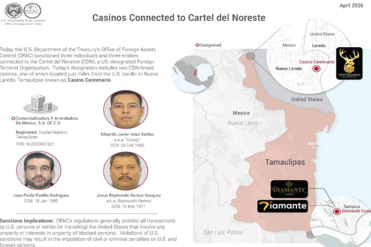 Las sanciones también alcanzan al Casino Centenario, ubicado en Nuevo Laredo, el cual habría sido utilizado para almacenar drogas, lavar dinero y operar actividades delictivas cerca de la frontera.