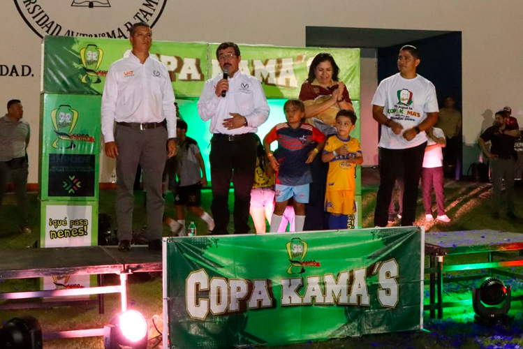 Ciudad Victoria, Tamaulipas.- En el marco del fortalecimiento de la vinculación social y el impulso a la formación integral de la niñez y juventud, el rector de la Universidad Autónoma de Tamaulipas (UAT), Dámaso Anaya Alvarado, inauguró la Copa Kama’s de futbol la noche de este viernes 17 de abril en las instalaciones del Gimnasio Multidisciplinario Mante, espacio universitario que fungió como sede del evento.